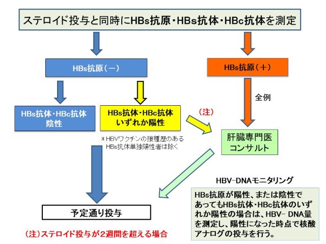 突発性難聴や顔面神経麻痺、あるいは低音障害型感音難聴、自己免疫疾患などの患者に対し全身ステロイド治療を行う場合、ステロイド投与と同時にHBs抗原・HBs抗体・HBc抗体の検査を行う。HBs抗原が陽性の場合はB型肝炎を発症する可能性があるため、治療を継続しつつ全例を肝臓専門医に紹介する。また、HBs抗原が陰性でもHBs抗体・HBc抗体のいずれかが陽性の場合はB型肝炎を発症する可能性があるため、ステロイドを2週間以上投与する場合は肝臓専門医に紹介することが望ましい。但し、HBVワクチンの接種歴のあるHBs抗体単独陽性者は除く。